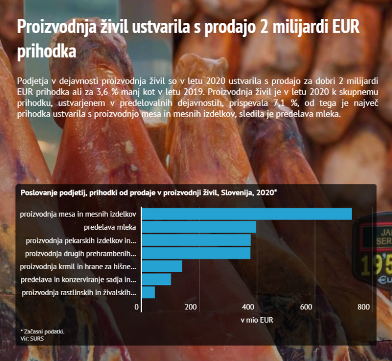 Podjetja v dejavnosti proizvodnje živil so lani s prodajo ustvarila za dobri dve milijardi evrov prihodka, kar je 3,6 odstotka manj kot v letu 2019.