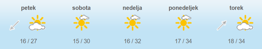 Danes se bo čez dan postopno jasnilo. Jutri bo večinoma sončno, najvišje dnevne temperature bodo do 31 stopinj Celzija. V nedeljo in ponedeljek pa bo iz dneva v dan bolj vroče.