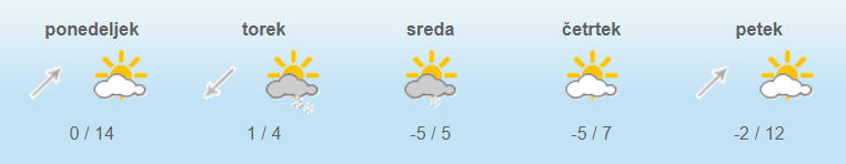 Najnižje jutranje temperature bodo od -3 do 1, na Primorskem do 4, najvišje dnevne od 0 do 6, na Primorskem do 8 stopinje Celzija.