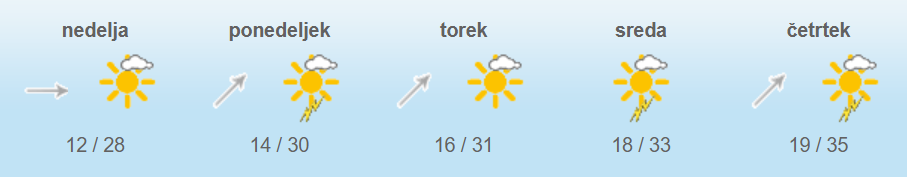 Najvišje dnevne temperature bodo od 27 do 31 stopinj Celzija.