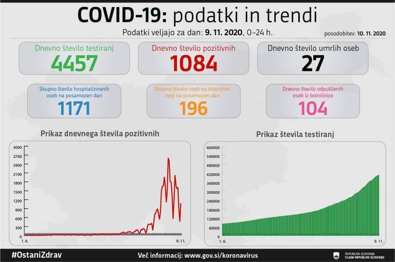 V Sloveniji so v včeraj, 9. novembra, opravili 4457 testiranj na koronavirus in potrdili 1084 novih okužb, delež pozitivnih je bil 24,32 odstotka vseh testiranih.