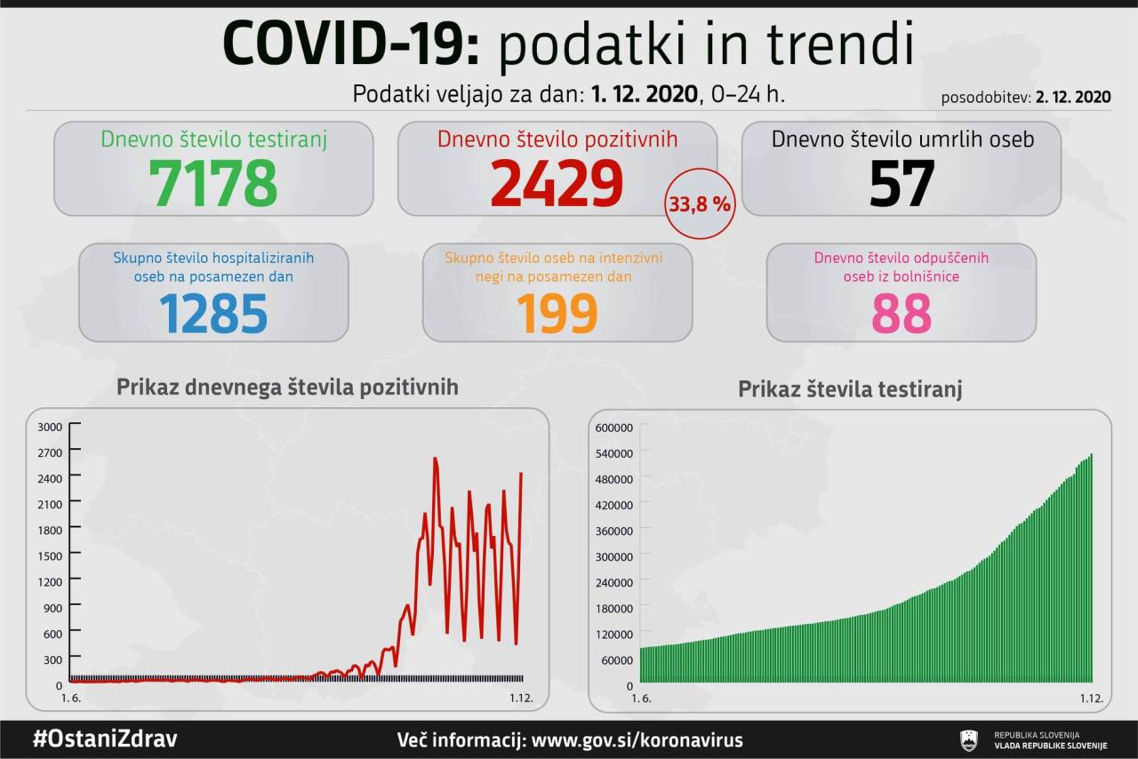 V Sloveniji so v včeraj, 1. decembra, opravili 7178 testiranj na koronavirus in potrdili 2429 novih okužb. To pomeni, da je bil delež pozitivnih testov tokrat kar 33,8 odstotka.