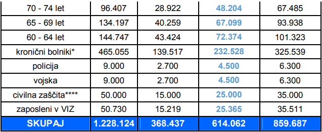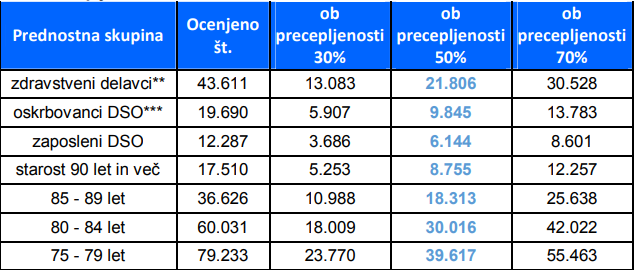 Na podlagi tabele prednostnih skupin bi tako za 50-odstotno precepljenost 'rizičnega' prebivalstva potrebovali več kot 614 tisoč cepljenih prebivalcev, za 70-odstotno precepljenost pa bi se moralo cepiti skoraj 860 tisoč posameznikov.