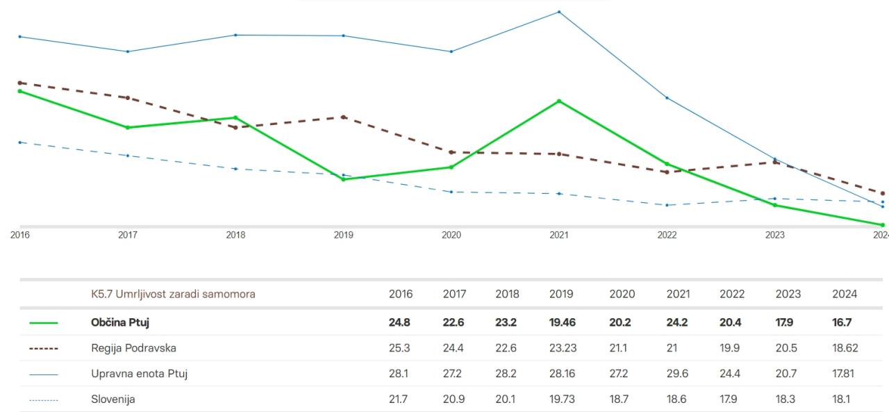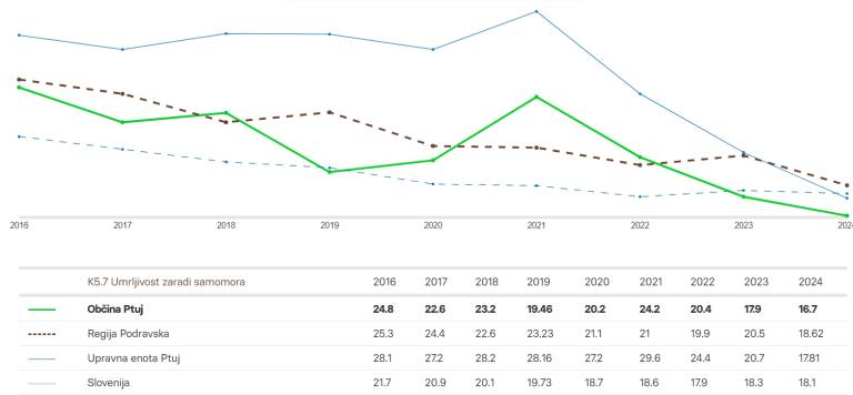 Stopnja umrljivosti zaradi samomora za leto 2024 znaša 17 na 100.000 prebivalcev, v Sloveniji pa 18. V preteklih letih je bila stopnja umrljivosti zaradi samomora v ptujski občini višja, kot na ravni državi, razen leta 2019 in leta 2023.