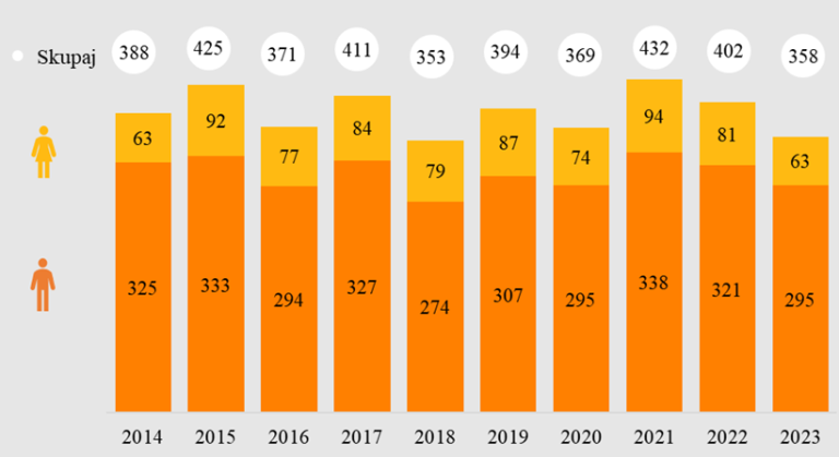 V Sloveniji je lani zaradi samomora umrlo 358 oseb, od tega je bilo 295 moških in 63 žensk. Tako najbolj skrb vzbujajoča statistika ostaja nesorazmerno visoko število samomorov pri moških. Razmerje med spoloma v letu 2023 je bilo namreč 4,6, kar pomeni, da so moški zaradi samomora umirali 4,5-krat pogosteje v primerjavi z ženskami.