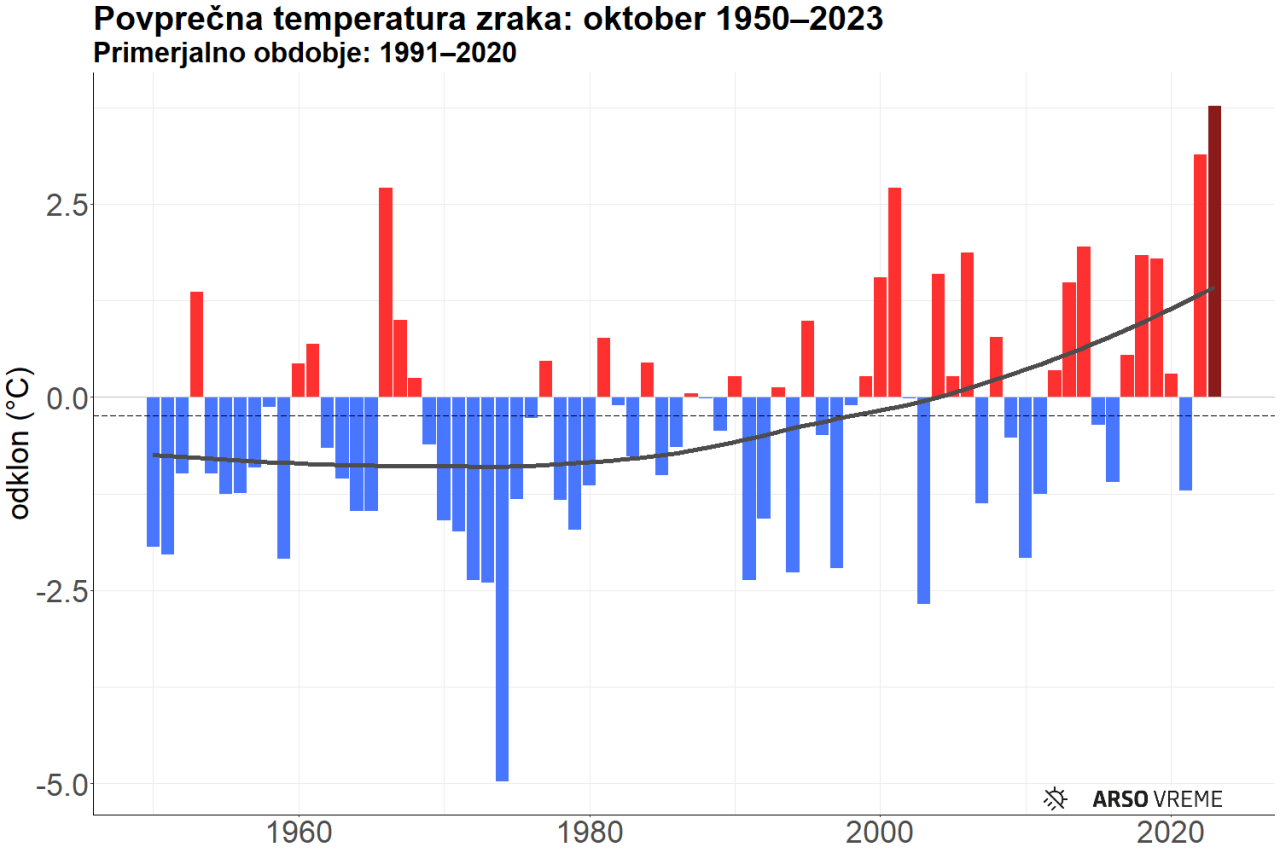 Odklon temperature zraka od povprečja primerjalnega obdobja (1991-2020) je na državni ravni znašal 3,8 stopinje Celzija, kar letošnji oktober uvršča med najtoplejši vsaj od leta 1950.