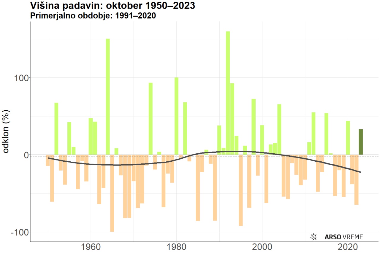 Oktober je bil na ravni celotne države nadpovprečno namočen glede na primerjalno obdobje 1991–2020, kazalnik višine padavin je znašal 133 odstotkov.