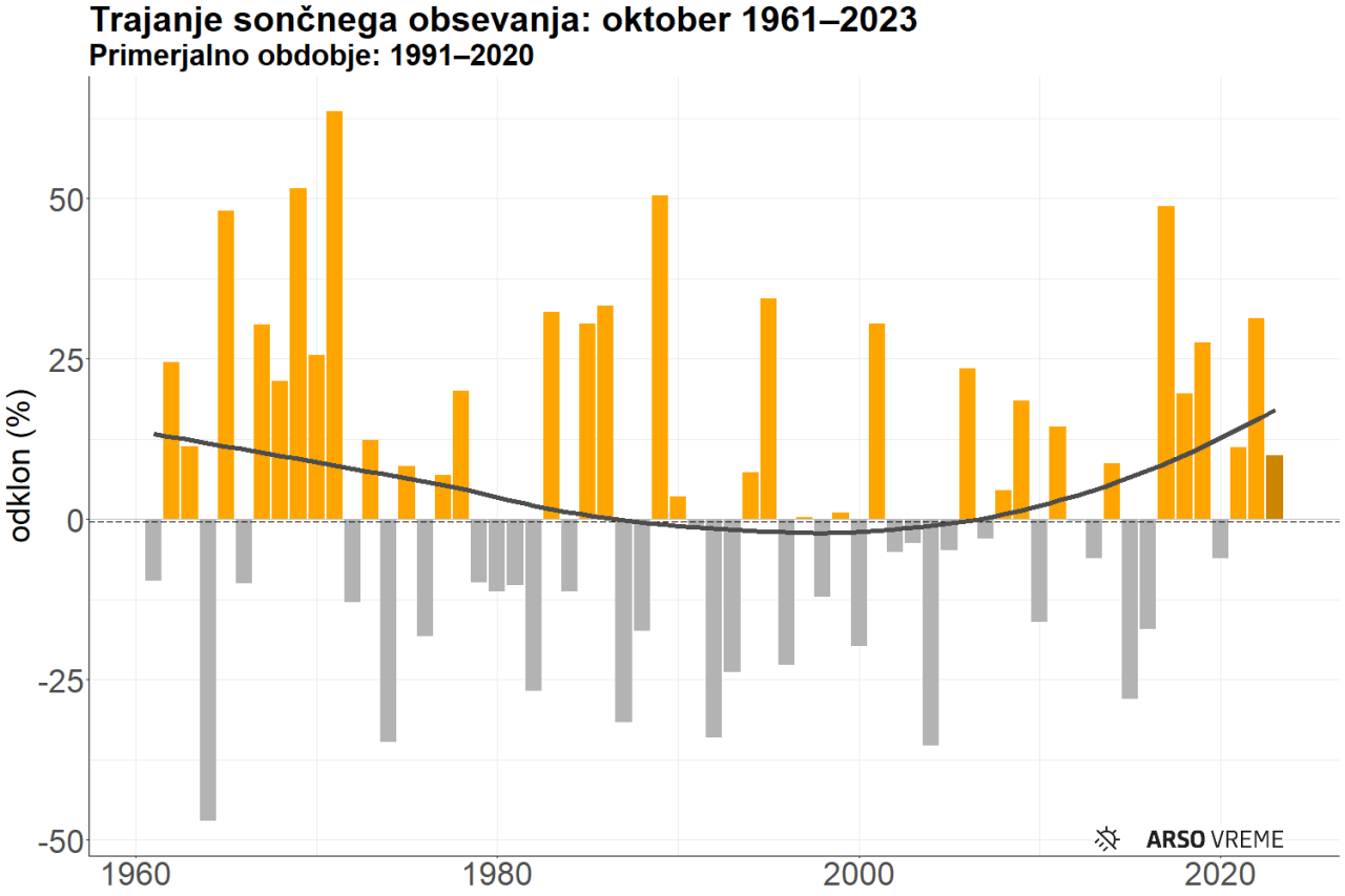 Trajanje sončnega obsevanja v oktobru je na ravni države od šestdesetih let do konca prejšnjega stoletja padalo, od takrat pa se zvišuje.
