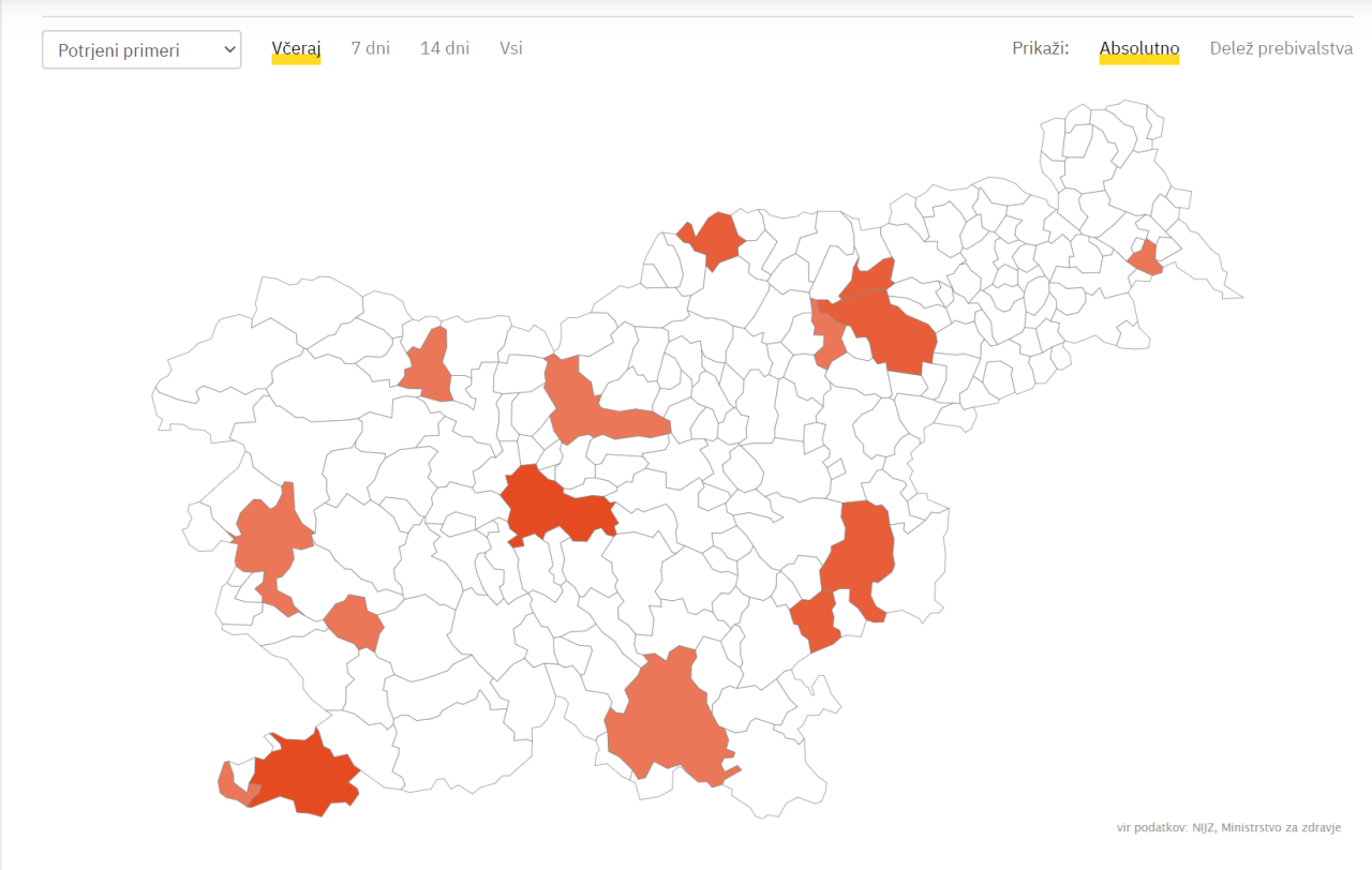 Po eno novo okužbo so potrdili v občinah Piran, Vipava, Nova Gorica, Kočevje, Radovljica, Kamnik in Črenšovci.