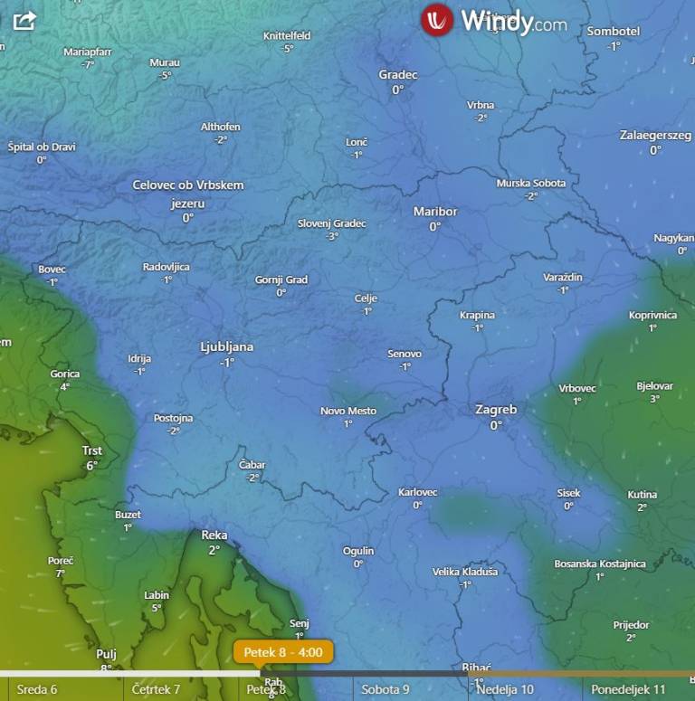 Windy, aplikacija za napovedovanje in vizualizacijo vremena, prikazuje, da bodo temperature iz četrtka na petek v Pomurju padle pod ledišče.