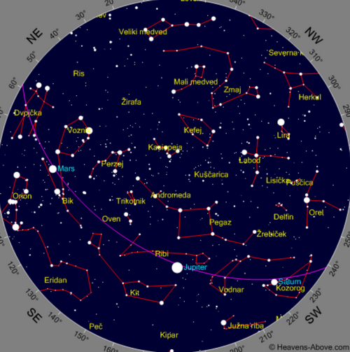 Albin Gradišnik iz amaterske vremenske postaje v Krčevini pri Vurberku pojasni, da se s prostim očesom ozremo proti ozvezdju Ribi. Pri tem si pomagajte s to zvezdno karto.