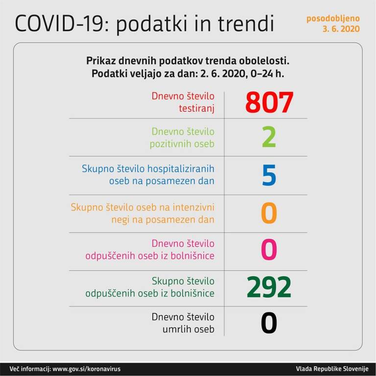 Po zadnjih podatkih, ki jih je sporočila vlada, je bilo včeraj v štirindvajsetih urah opravljenih 807 testiranj, od tega sta bili dve osebi okuženi s koronavirusom.