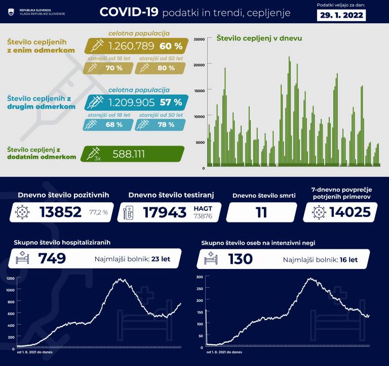 Trenutno je po podatkih Covid-19 Sledilnika v bolnišnicah hospitaliziranih 749 covidnih pacientov, od tega je 130 pacientov na intenzivni negi.