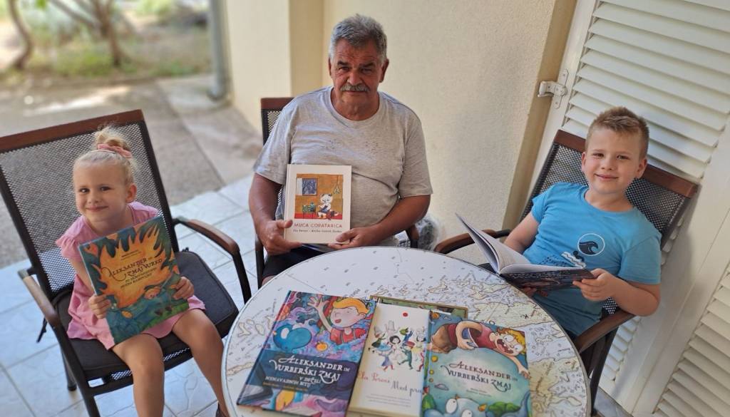 Ob njem pa sedita Alina in Aleksander Jambrek iz Dupleka, nečaka Brede Mulec, ki je avtorica štirih pravljic o zmaju Vurku.