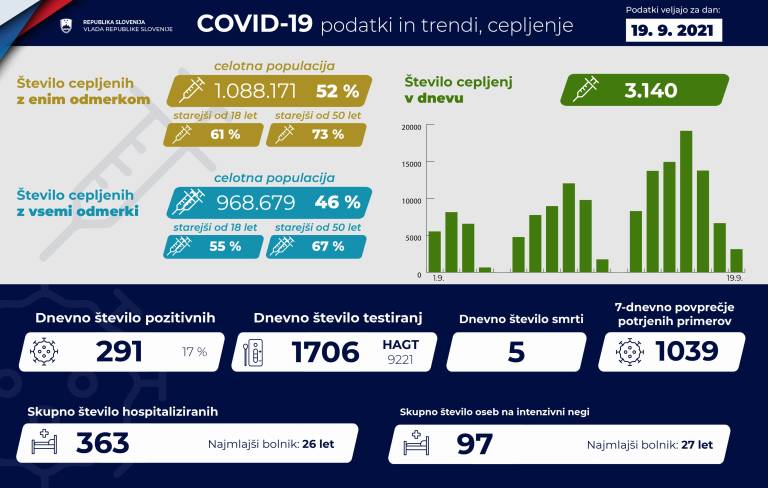 V Sloveniji so včeraj, 19. septembra, opravili 1706 PCR testiranj na koronavirus in potrdili 291 novih okužb, gre za 17,1-odstotni delež okužb.