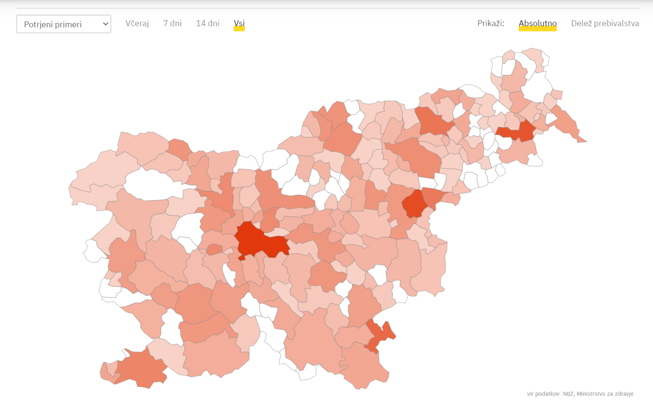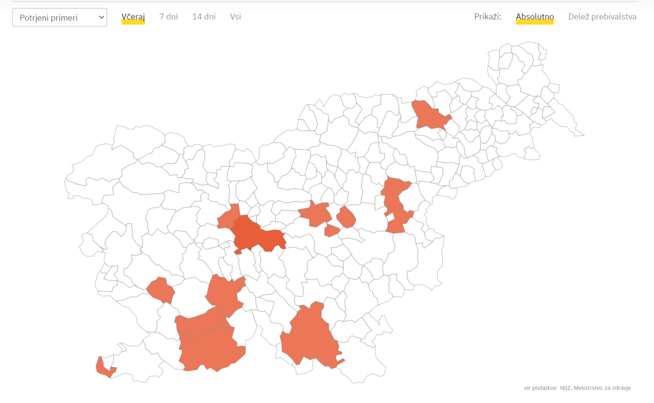 Dve okužbi so včeraj zabeležili v občini Ljubljana, po eno okužbo pa v občinah Maribor, Šentjur, Hrastnik, Zagorje ob Savi, Medvode, Kočevje, Cerknica, Vipava, Pivka, Ilirska Bistrica in Piran.