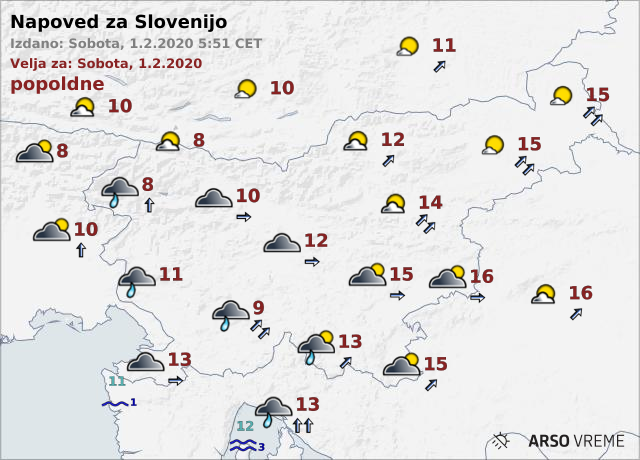 Pihal bo zahodni do jugozahodni veter. Najvišje dnevne temperature bodo od 8 do 13, na vzhodu do 16 stopinj Celzija.