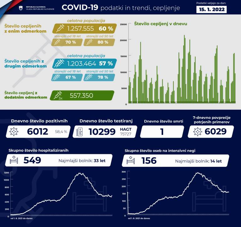 V Sloveniji so včeraj, 15. januarja, opravili 10.299 PCR testiranj na koronavirus in potrdili 6012 novih okužb, gre za 58,4-odstotni delež okužb.