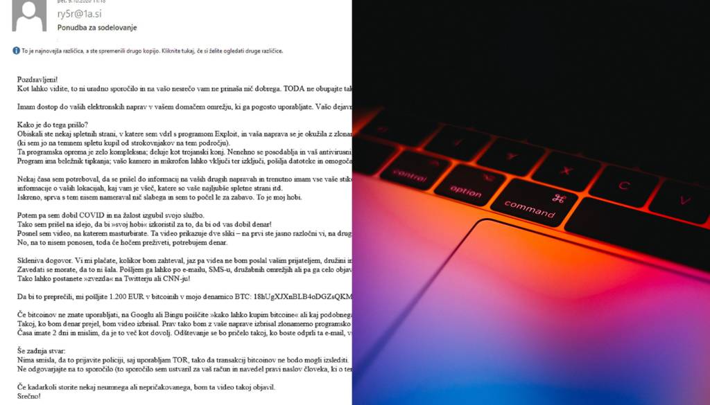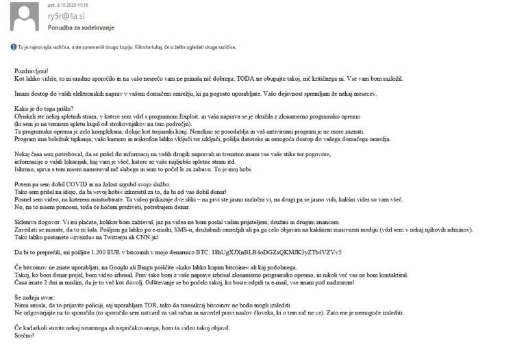 Ste prejeli sporočilo, v katerem vas neznanec izsiljuje z intimnimi posnetki, ki jih bo objavil na spletu, če mu ne nakažete 1.200 evrov?