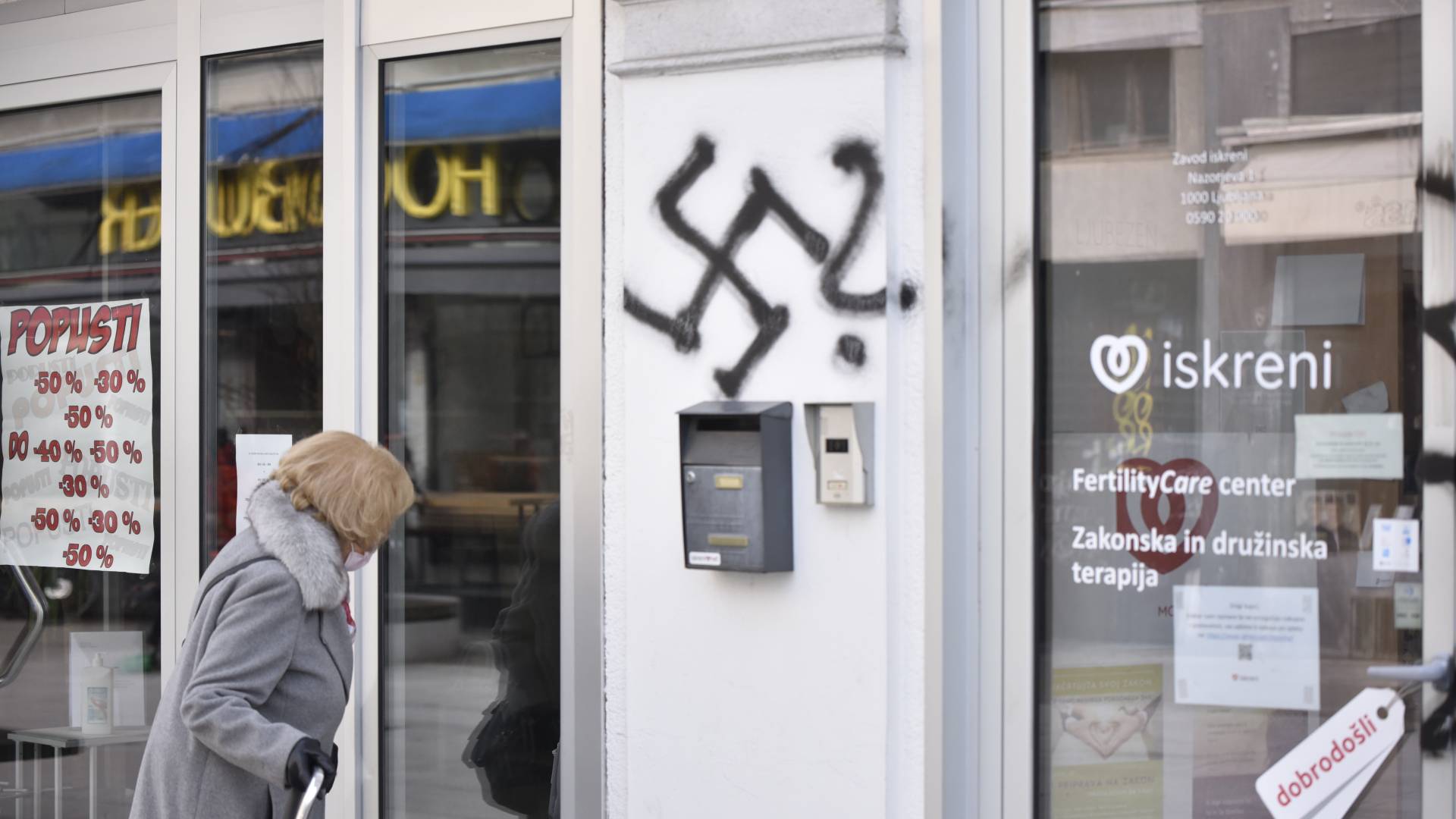 Neznanci so na fasado in vrata prostorov Zavoda Iskreni v Ljubljani narisali kljukasta križa, na vrata pa zapisali še »korupcija?«.