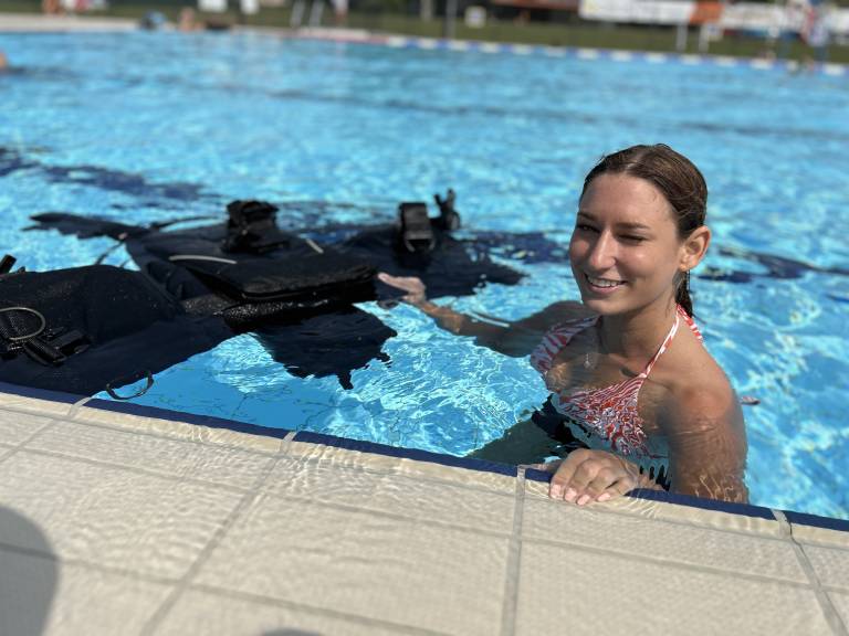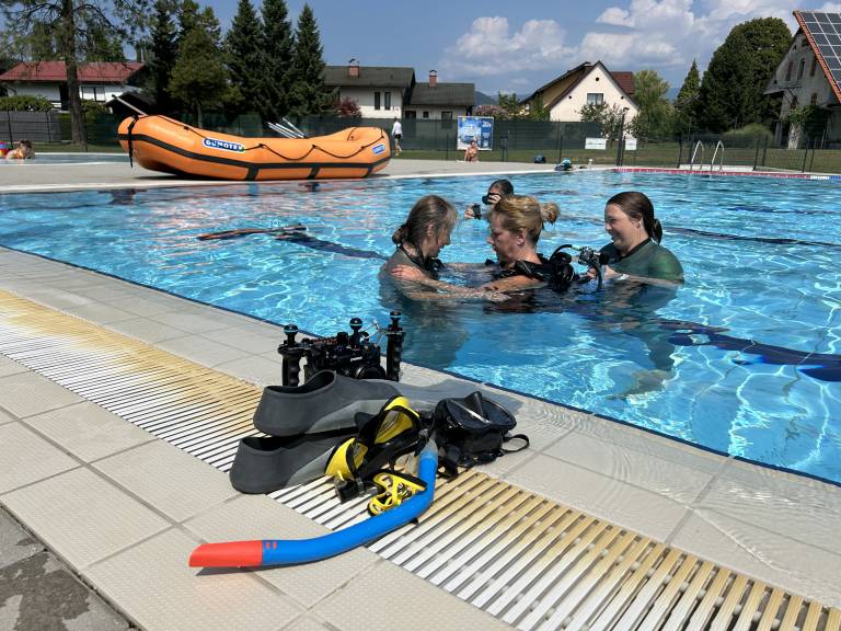 Jerneja Štarkel je pod budnim očesom potapljaških inštruktorjev na konjiškem bazenu prvič spoznavala podvodni svet.