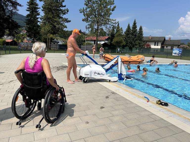 »To napravo uporabljamo za spuščanje ljudi v vodo, ki imajo gibalne težave oziroma so invalidi in drugi hendikepiranci,« je povedal inštruktor in reševalec iz vode Jure Kordež.