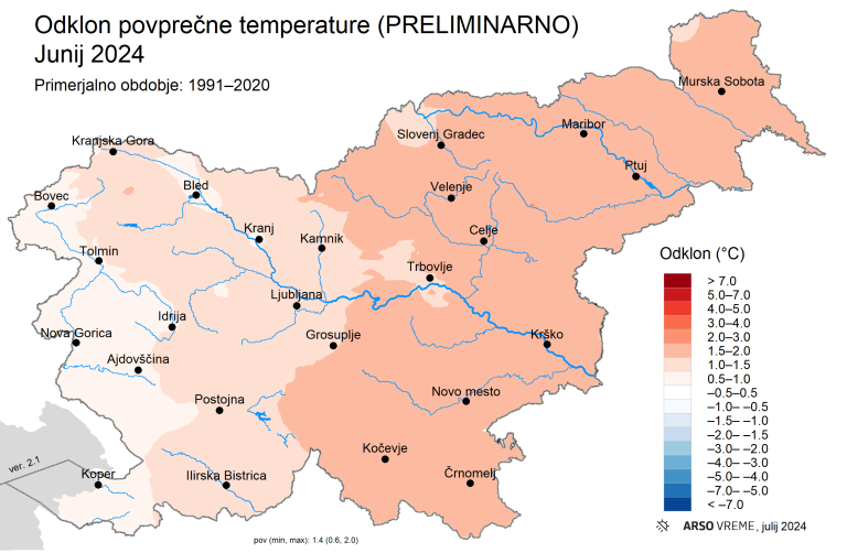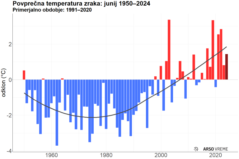 Odklon temperature zraka od povprečja primerjalnega obdobja 1991-2020 znašal 1,4 stopinje Celzija, kar je za 0,6 več od lanskega junija.