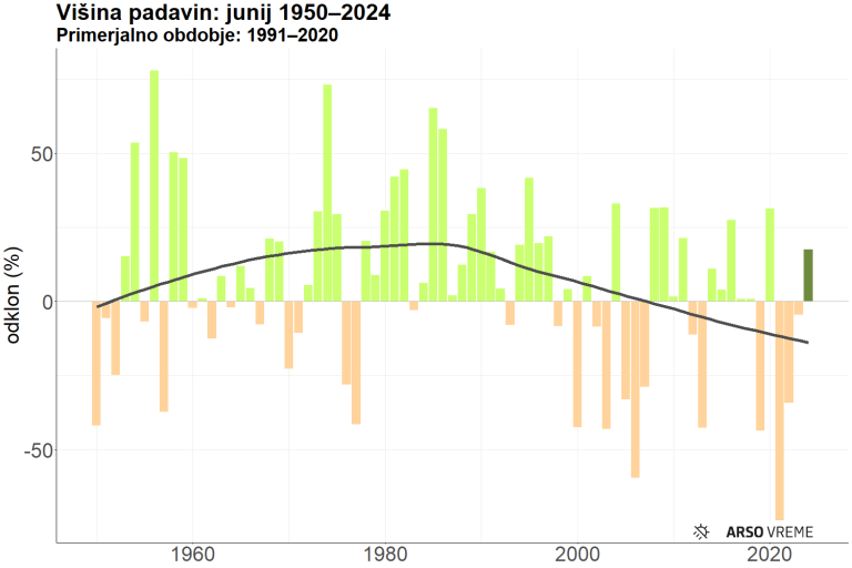 Hkrati je bila nadpovprečna tudi količina padavin, ki letošnji junij uvršča približno med tretjino najbolj namočenih v obdobju od leta 1950. Najbolj namočena sta bila junija 1956 in 1974, medtem ko je bil najmanj junij 2021.