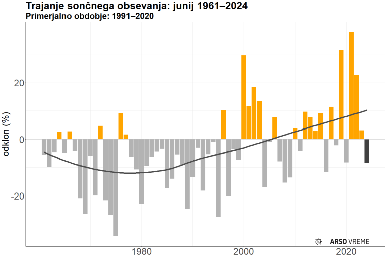 Kljub nadpovprečnim temperaturam pa je bil letošnji junij podpovprečno sončen. Trajanje sončnega obsevanja je bilo na državni ravni od povprečja nižje za osem odstotnih točk, kar mesec uvršča med približno 23 najmanj osončenih od leta 1961. V tem obdobju je bil najmanj osončen junij leta 1975, najbolj pa junij 2021.