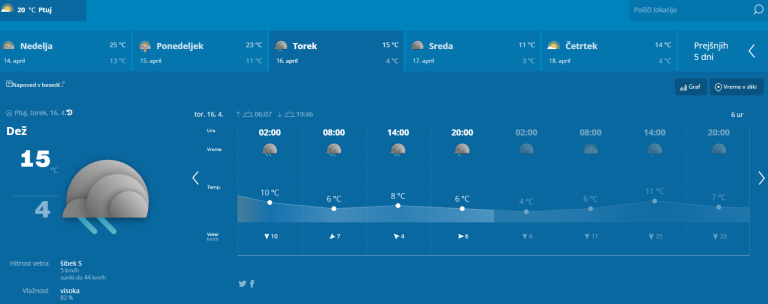 »Po torkovem prehodu fronte, ki bi nam lahko prinesel tudi kar obilne padavine in nizko mejo sneženja, bodo sledila precej hladna jutra, a zaenkrat ne kaže, da bo udarila pozeba, popoldanske temperature pa se bodo v prihodnjem tednu gibale okoli 15 stopinj Celzija, kar pa je v bistvu zelo blizu povprečja za ta čas,« zaključuje meteorolog Rok Nosan.