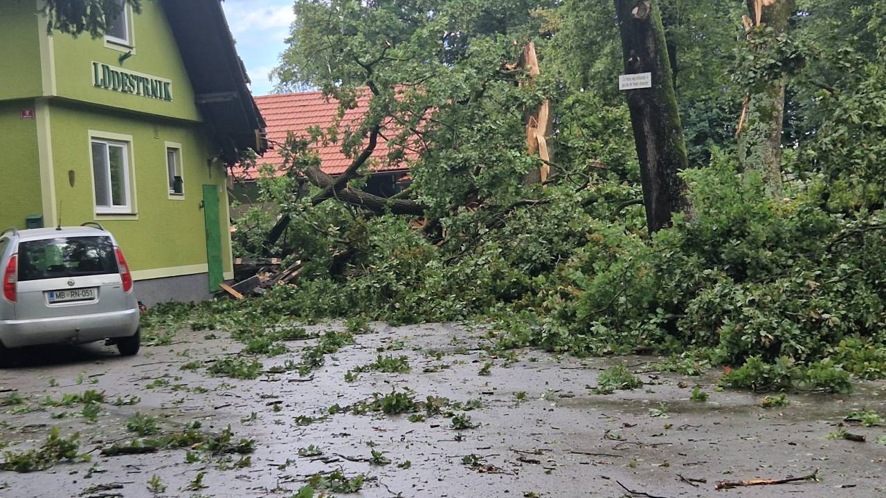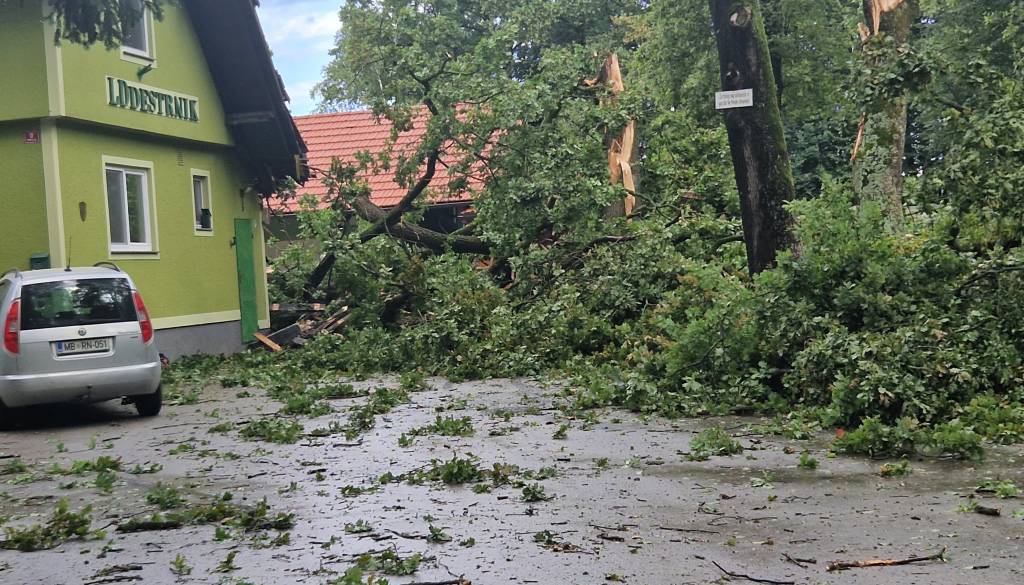 Podiralo je drevesa in odkrivalo strehe, v Mežici je meteorna voda zalila skladišče podjetja. Vročina in nevihte so napovedane tudi za danes.