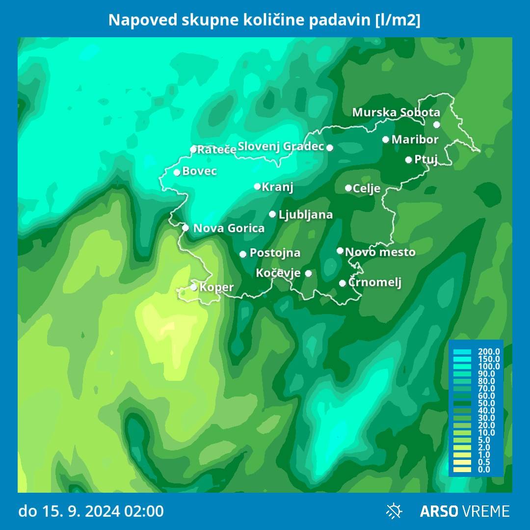 Do petka zjutraj lahko v zahodni polovici Slovenije pade od 90 do 140, drugod od 50 do 90 litrov dežja na kvadratni meter. Ob padavinskih pasovih lahko krajevno pade več dežja.