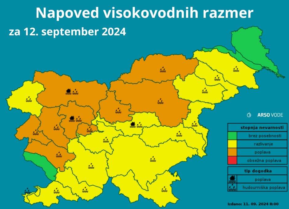 V noči na četrtek bodo ob nevihtah z močnimi nalivi hitro naraščali hudourniški vodotoki in manjše reke v zahodni Sloveniji, čez dan pa tudi drugod, predvsem v osrednji in severni Sloveniji.