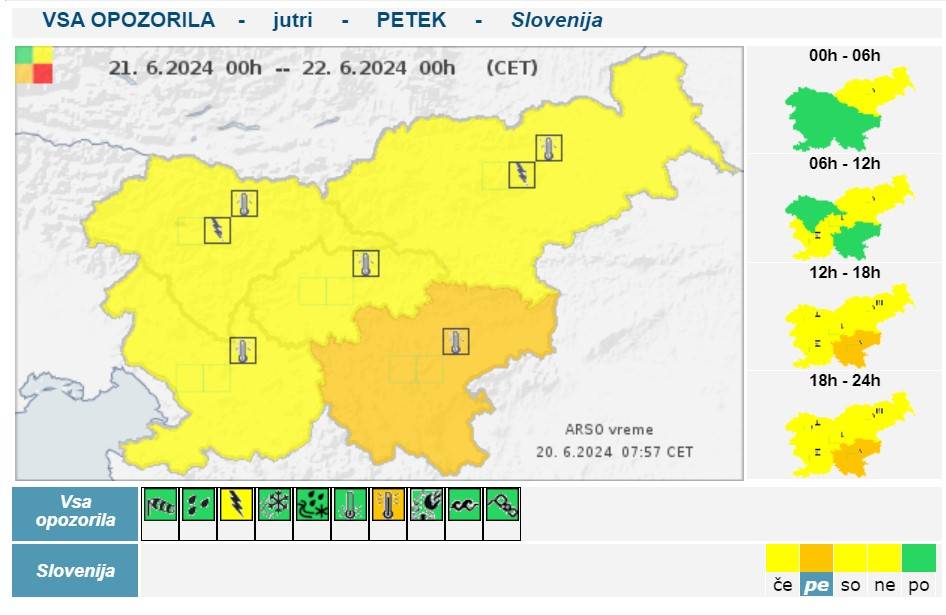 Jutri sredi dneva in popoldne bo predvsem v jugovzhodnih krajih velika toplotna obremenitev. Arso je zato izdal rumeno opozorilo za vso državo, z izjemo jugovzhoda, kjer velja oranžno opozorilo.