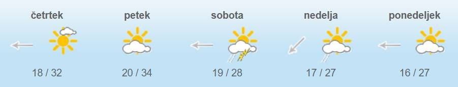 Najnižje jutranje temperature bodo od 16 do 21, najvišje dnevne od 30 do 36 stopinj Celzija.