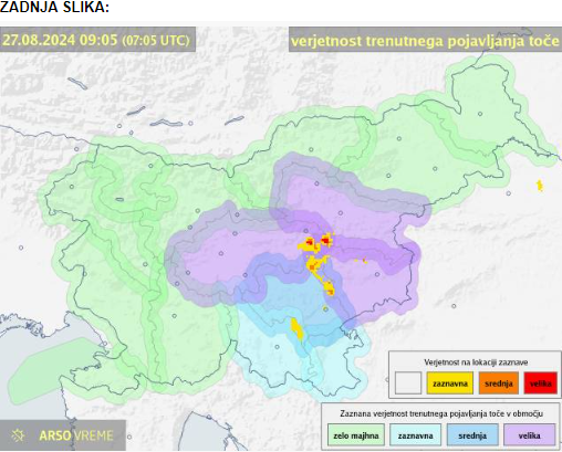 Kljub temu je Agencija Republike Slovenije za okolje prižgala vijolični alarm za veliko možnost pojavljanja toče za Ljubljano in okolico, Spodnje Posavje ter Savinjsko.