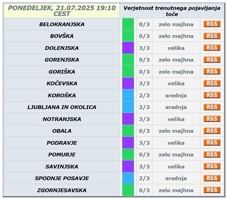 Vijoličasto opozorilo za veliko verjetnost trenutnega pojavljanja toče trenutno velja Dolenjsko, Kočevsko, Notranjsko, Podravje in Savinjsko.