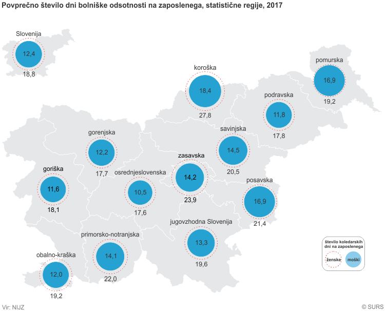 Moški v podravski regiji imajo v povprečju za 11,8 koledarskih dni bolniške odsotnosti, ženske pa 17,8 dni.