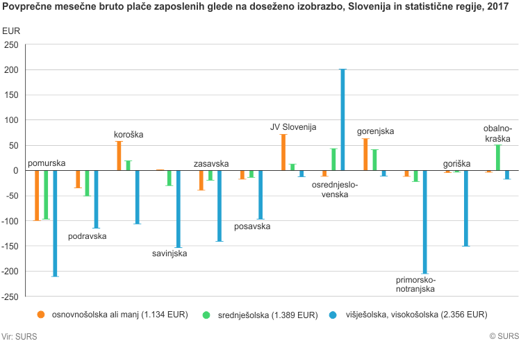 Na državni ravni je povprečna mesečna bruto plača oseb z osnovnošolsko izobrazbo ali manj v 2017 znašala 1.134 evrov, medtem ko so osebe s srednješolsko izobrazbo mesečno služile 1.389 evrov, osebe z višješolsko ali visokošolsko izobrazbo pa 2.356 evrov bruto.