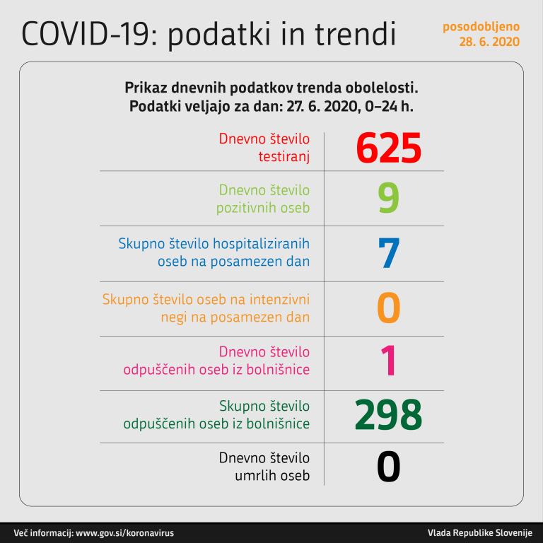 Včeraj, 27. junija, so v Sloveniji opravili 625 testiranj za novi koronavirus.