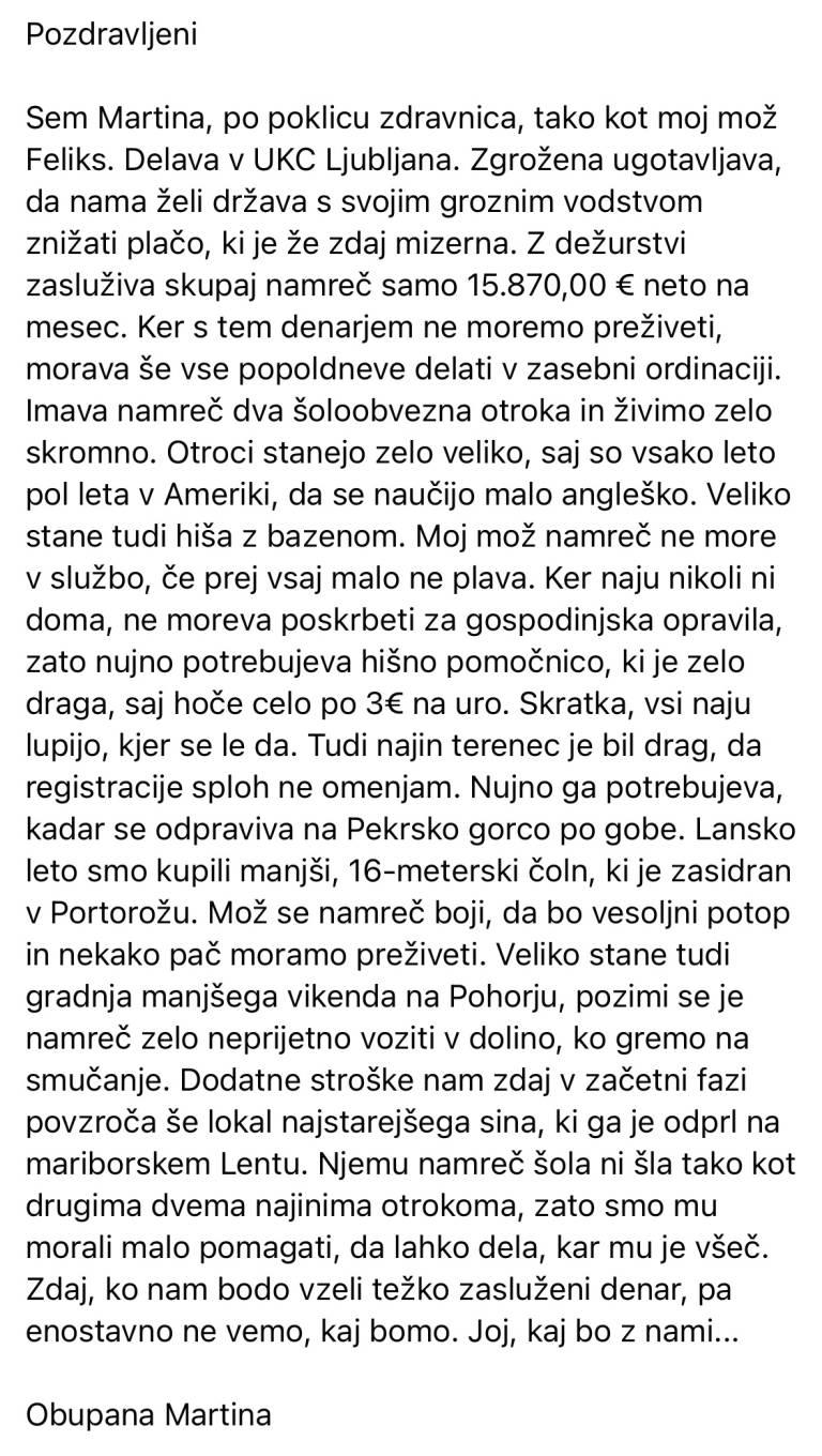 Gre za zapis 'zdravnice Martine', v zapisu pa navaja, da z možem za delo v Univerzitetnem kliničnem centru v Ljubljani prejemata mizerno plačo v višini slabih 16.000 evrov.