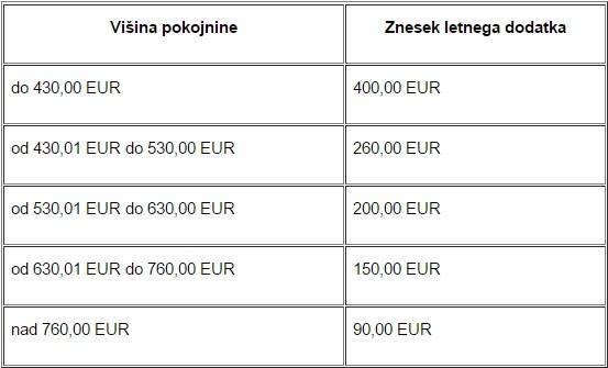 Zneski izplačanih letnih dodatkov se bodo sicer letos v primerjavi z lanskim letom dvignili za deset evrov. Zavod za pokojninsko in invalidsko zavarovanje Slovenije je to stalo dodatnih 21 milijonov evrov, finančna ministrica Mateja Vraničar Erman je zagotovila, da bo pokojninska blagajna lahko pokrila tudi ta dodatni odhodek.