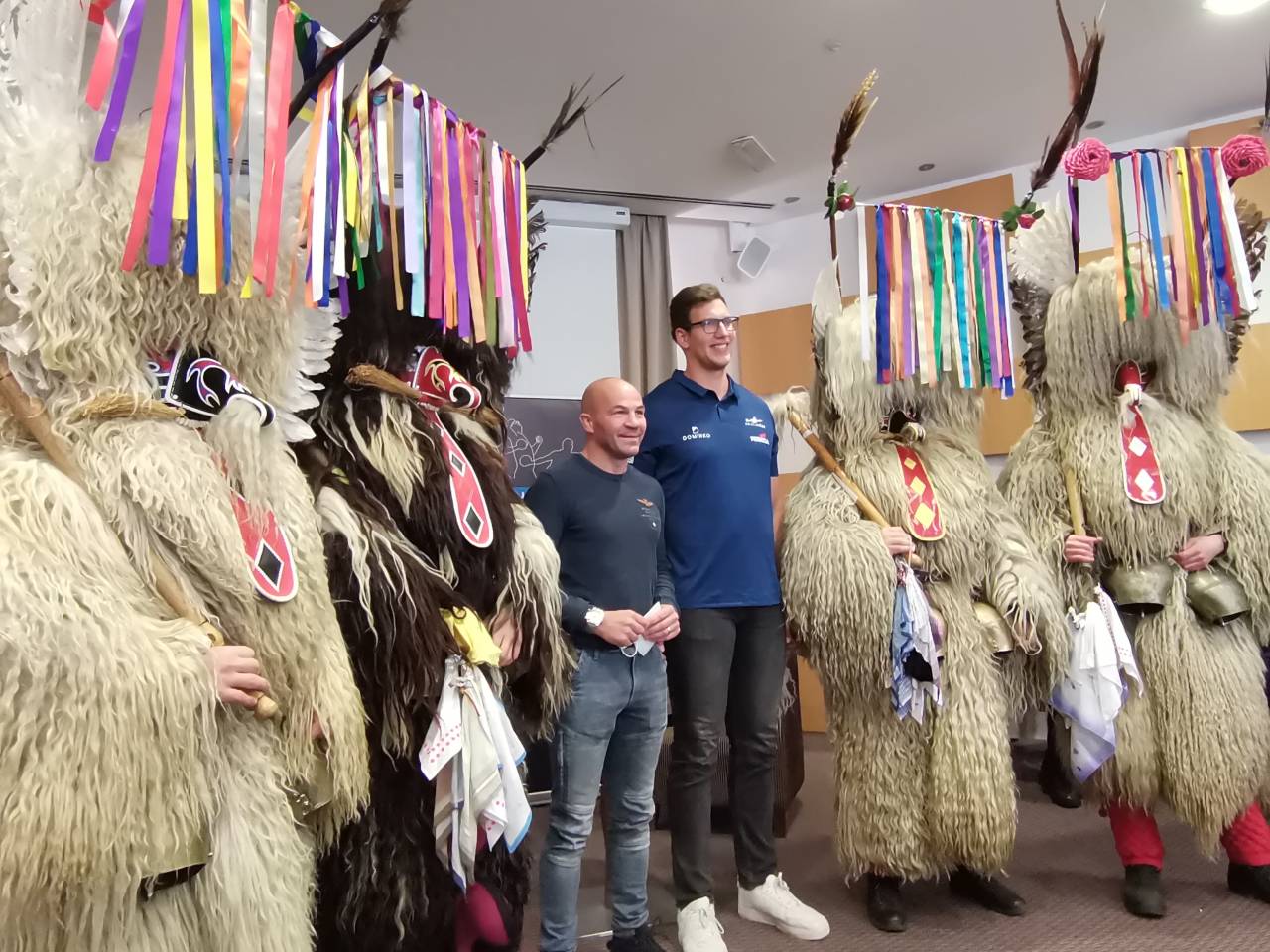 Čeha so na Ptuju pozdravili tudi kurenti s Hajdine z Dejanom Zavcem na čelu in mu predali ježovko, za katero upajo, da bo krasila njegove prostore.