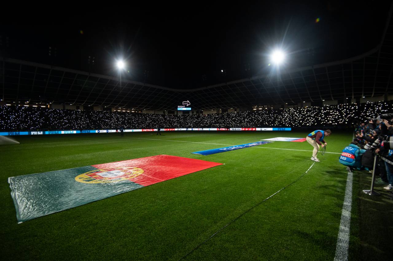 2' Slovenci in Portugalci se danes merijo na povsem novi zelenici, v Stožicah so v minulih tednih prenovili tudi ozvočenje in razsvetljavo, ki zdaj omogoča tudi posebne efekte.