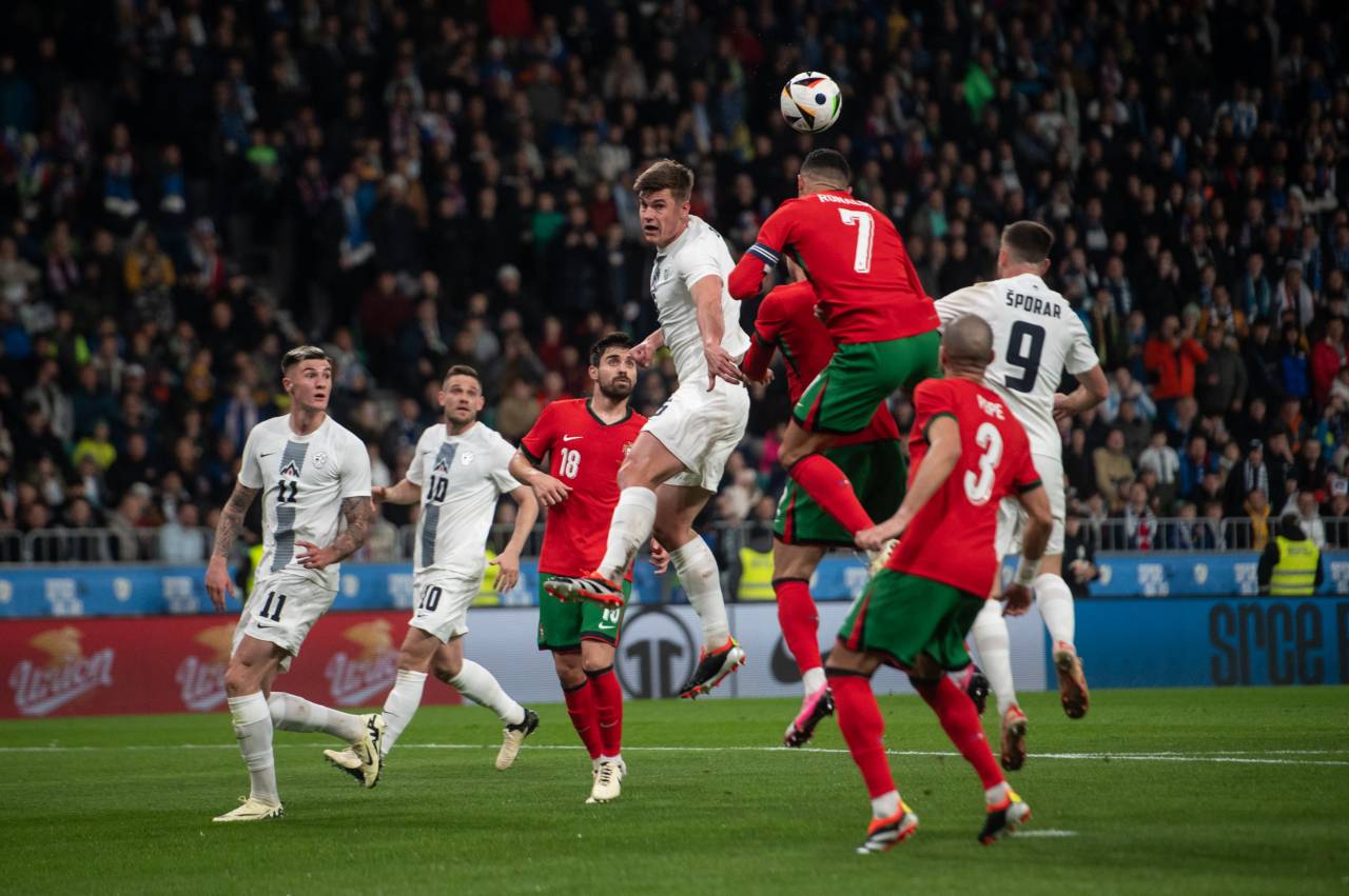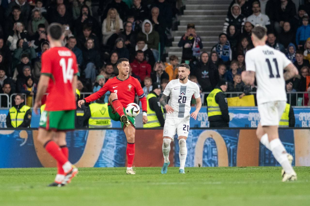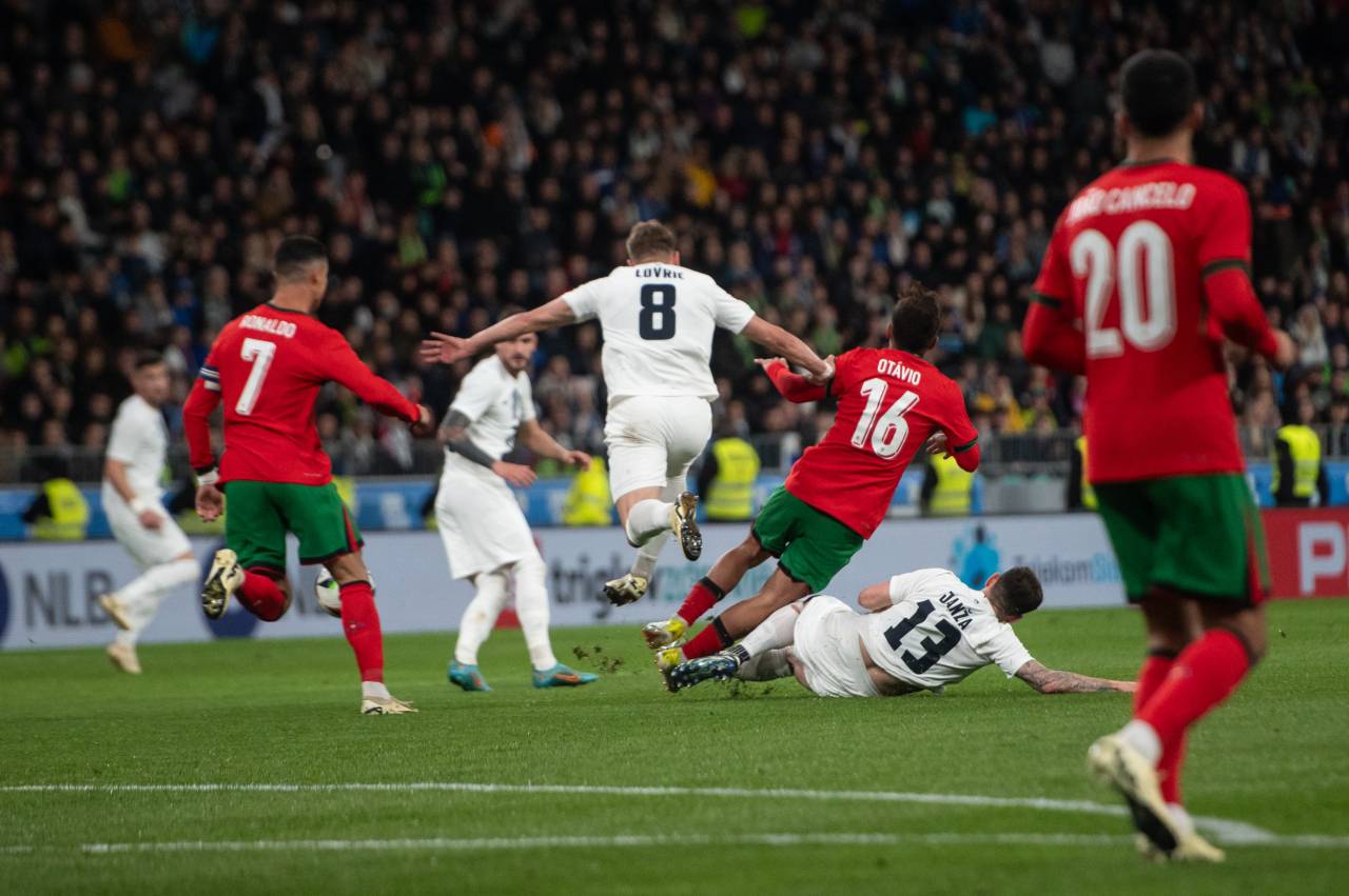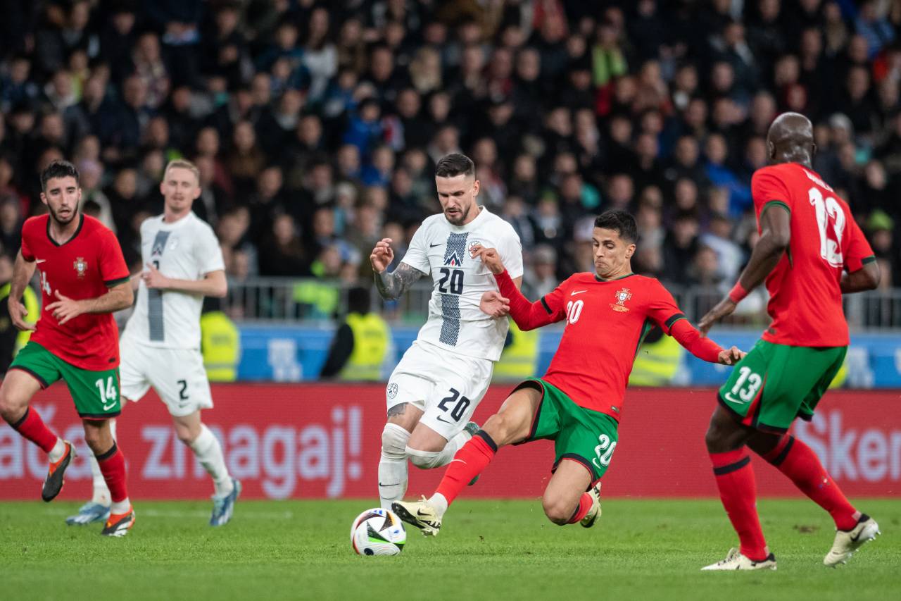 60' PRILOŽNOST! Jaka Bijol je skušal preigrati Cristiana Ronalda, a je žogo izgubil v nevarni coni, v nadaljevanju akcije pa ga je prav kapetan Portugalske izigral na desni strani kazenskega prostora in sprožil proti vratom Slovenije. Zadel je zunanji del mreže.