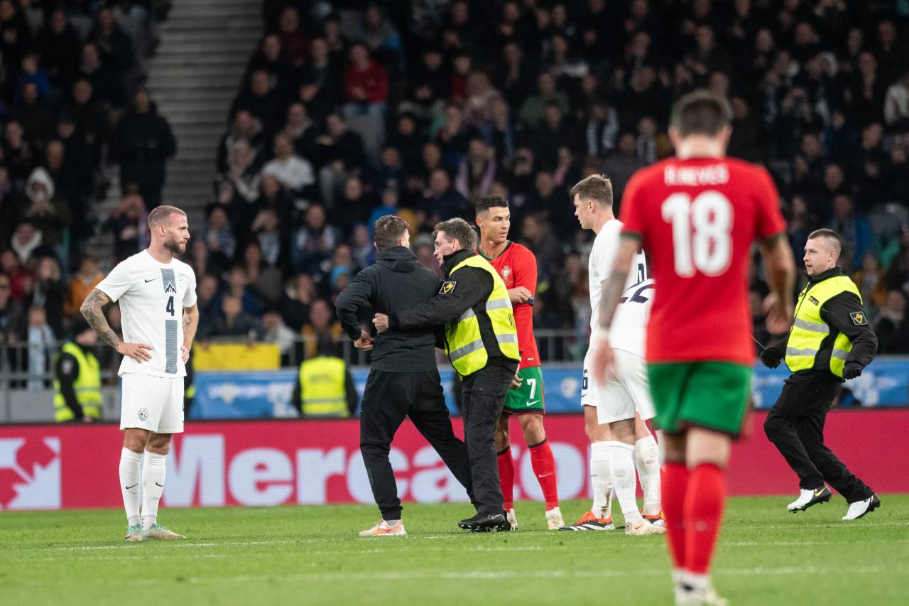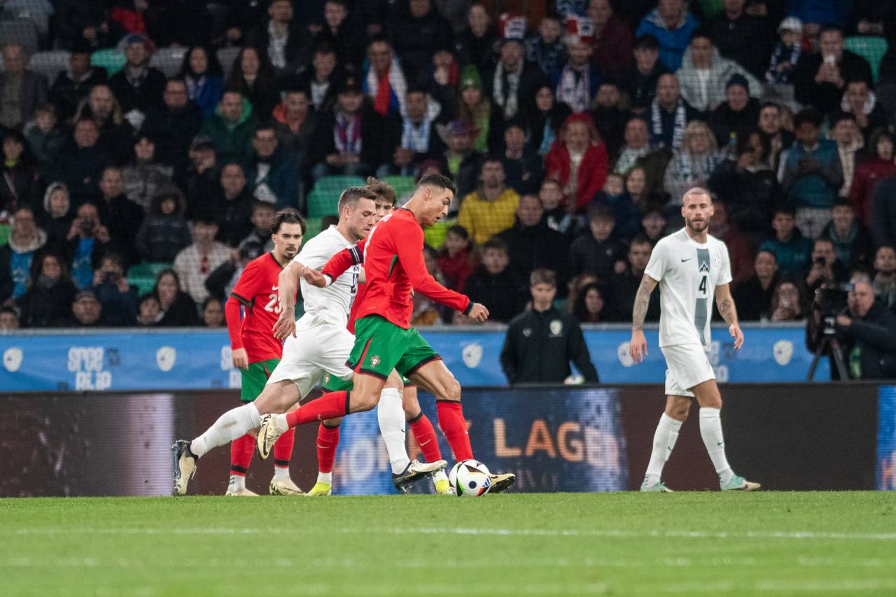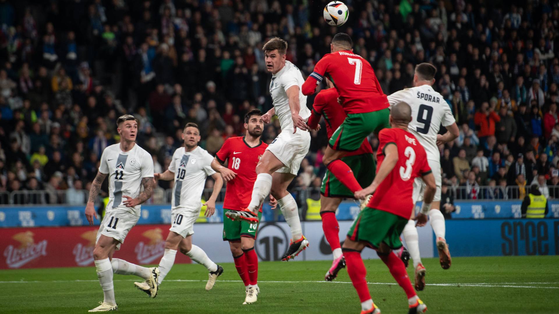 60' PRILOŽNOST! Jaka Bijol je skušal preigrati Cristiana Ronalda, a je žogo izgubil v nevarni coni, v nadaljevanju akcije pa ga je prav kapetan Portugalske izigral na desni strani kazenskega prostora in sprožil proti vratom Slovenije. Zadel je zunanji del mreže.