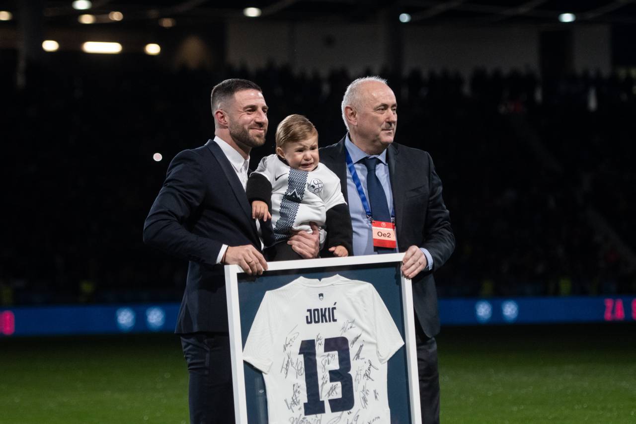 Pred tekmo: Bojan Jokić, ki je s stotimi reprezentančnimi tekmami drugi na večni lestvici slovenske izbrane vrste, je pred tekmo iz rok predsednika NZS Radenka Mijatovića prejel podpisani reprezentančni dres.