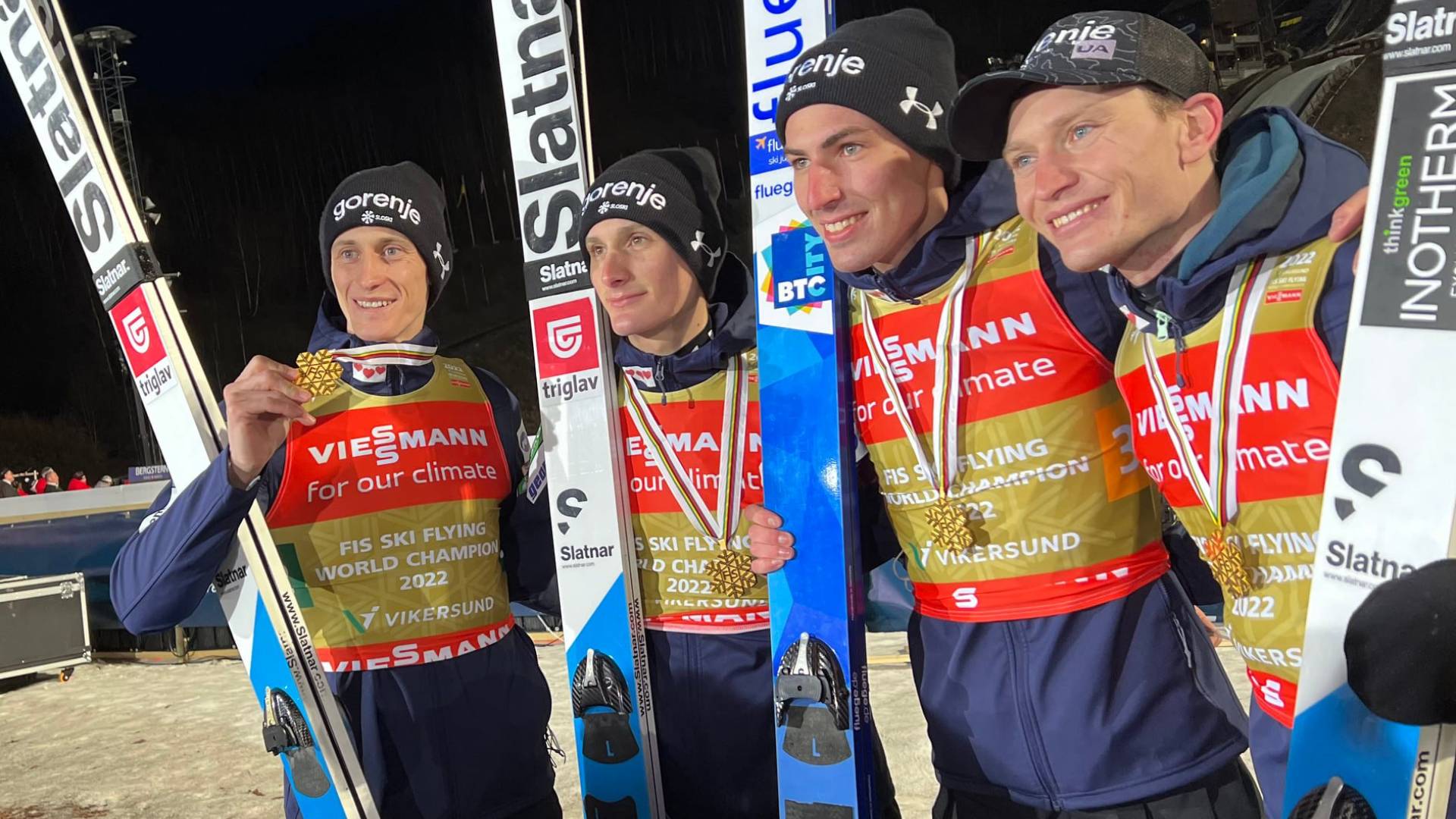 Domen Prevc, Peter Prevc, Timi Zajc in Anže Lanišek na ekipni tekmi z ogromno razliko postali svetovni prvaki v poletih.