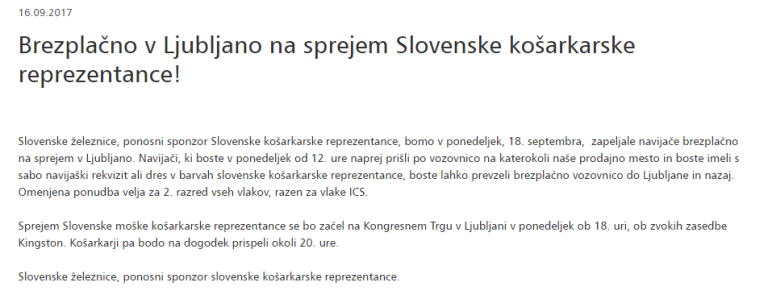 Proti Istanbulu je danes iz Brnika ob 11.30 odletelo še zadnje letalo s slovenskimi navijači, jutri pa se bo na Kongresnem trgu v Ljubljani uradno sprejelo slovenske košarkarje s prvo medaljo z evropskega prvenstva, kamor pa bodo Slovenske železnice omogočile brezplačno vožnjo in tudi nazaj. Brezplačne vozovnice bodo začeli deliti jutri ob 12. uri, zanjo pa je treba pokazati navijaški rekvizit.