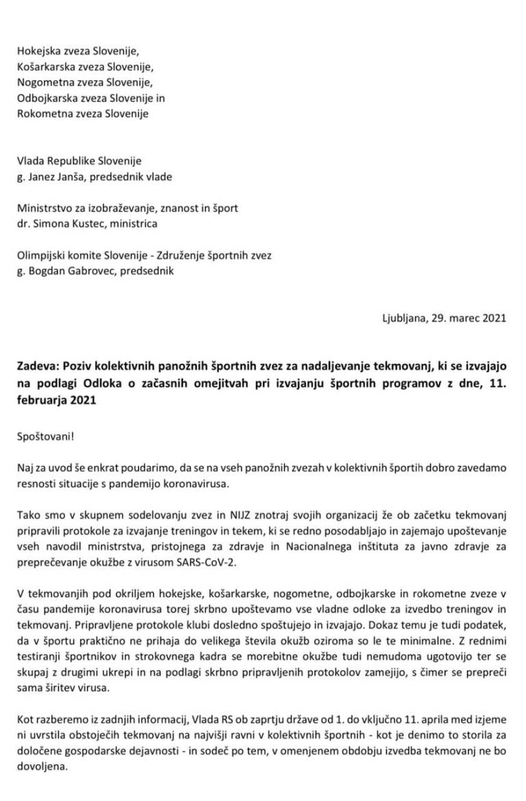 Dopis je bil naslovljen na Janeza Janšo, Simono Kustec in Bogdana Gabrovca, oziroma na vlado, na ministrstvo za izobraževanje, znanost in šport ter na Olimpijske komite Slovenije - Združenje športnih zvez.